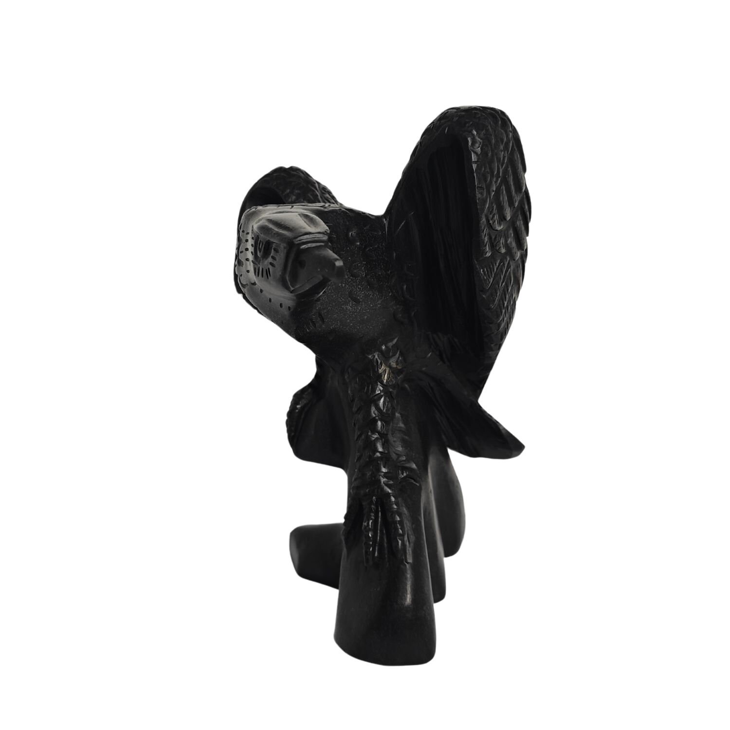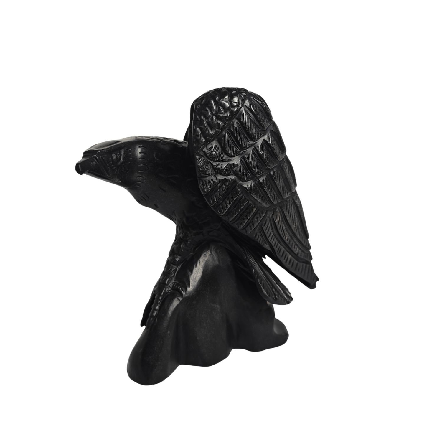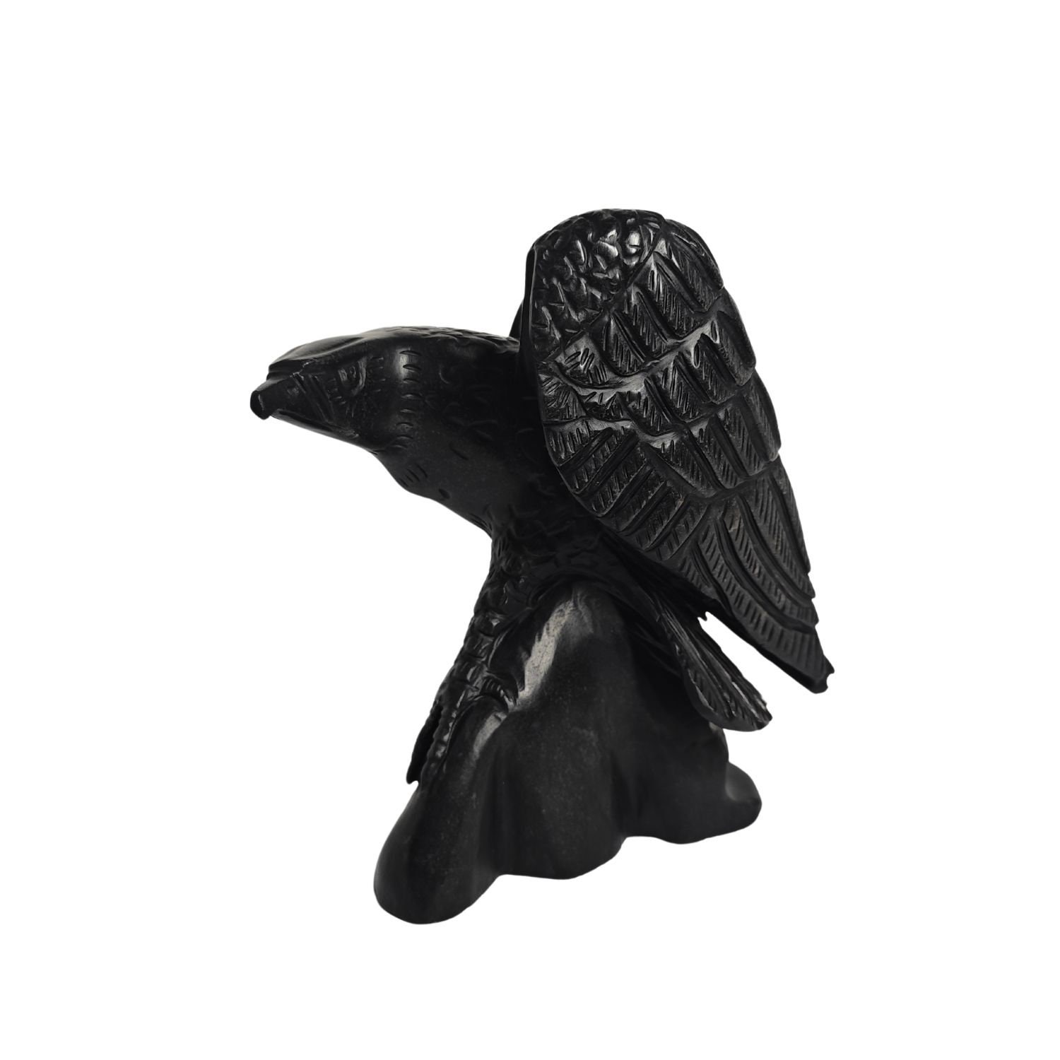 Figurine of a bird of prey/eagle perched on a stone. The figurine was handcrafted from black natural stone and is highly detailed. The dimensions are as follows: