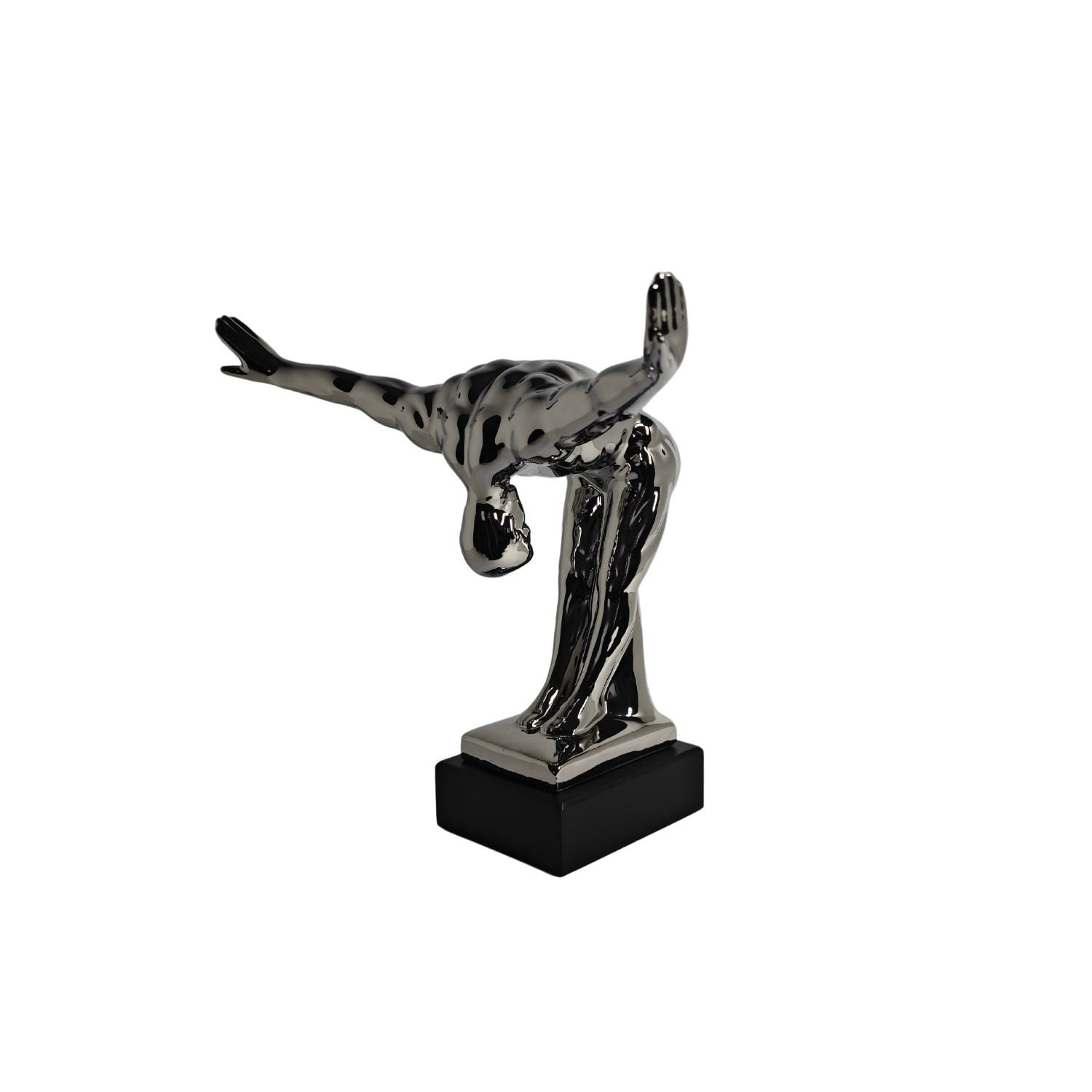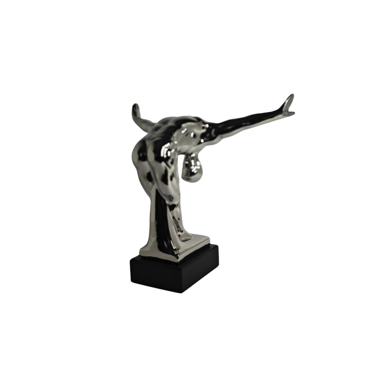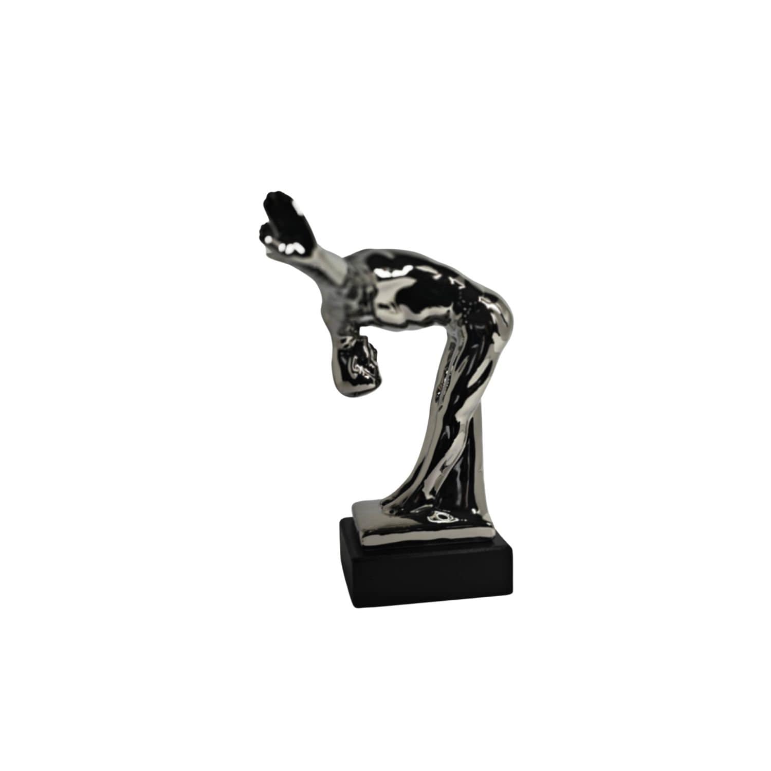 Modern sculpture of a bowing man. The sculpture is made of ceramic/porcelain with a silver coating, and the base is made of resin with a black coating. This sculpture integrates almost seamlessly into the living space. The dimensions are as follows: