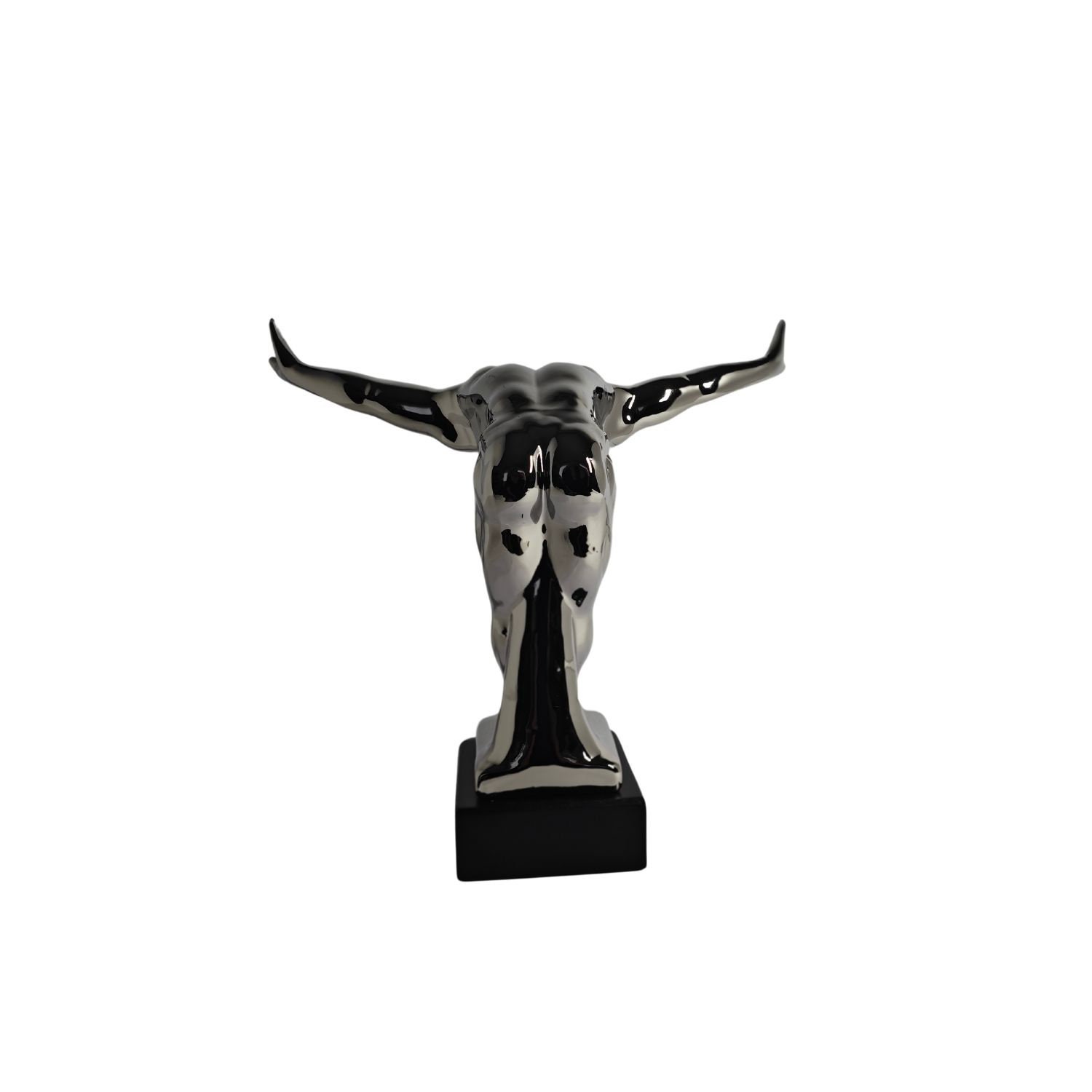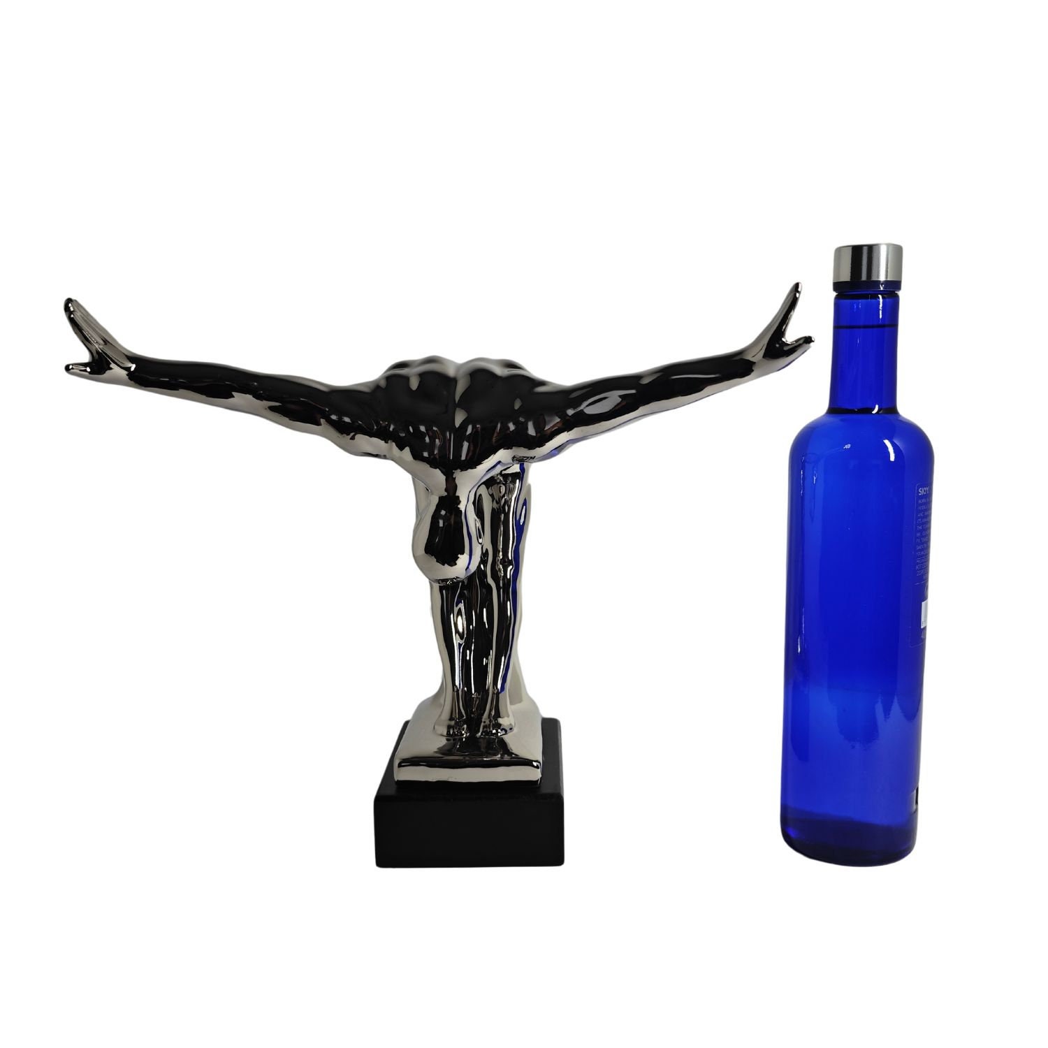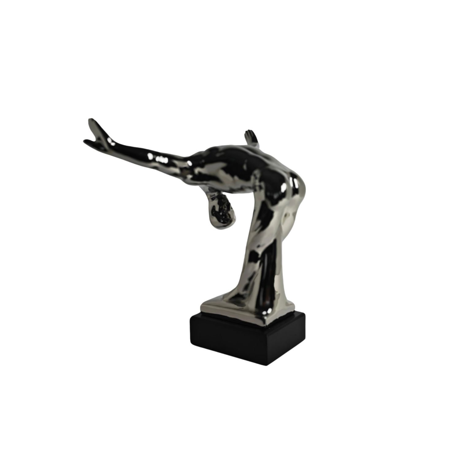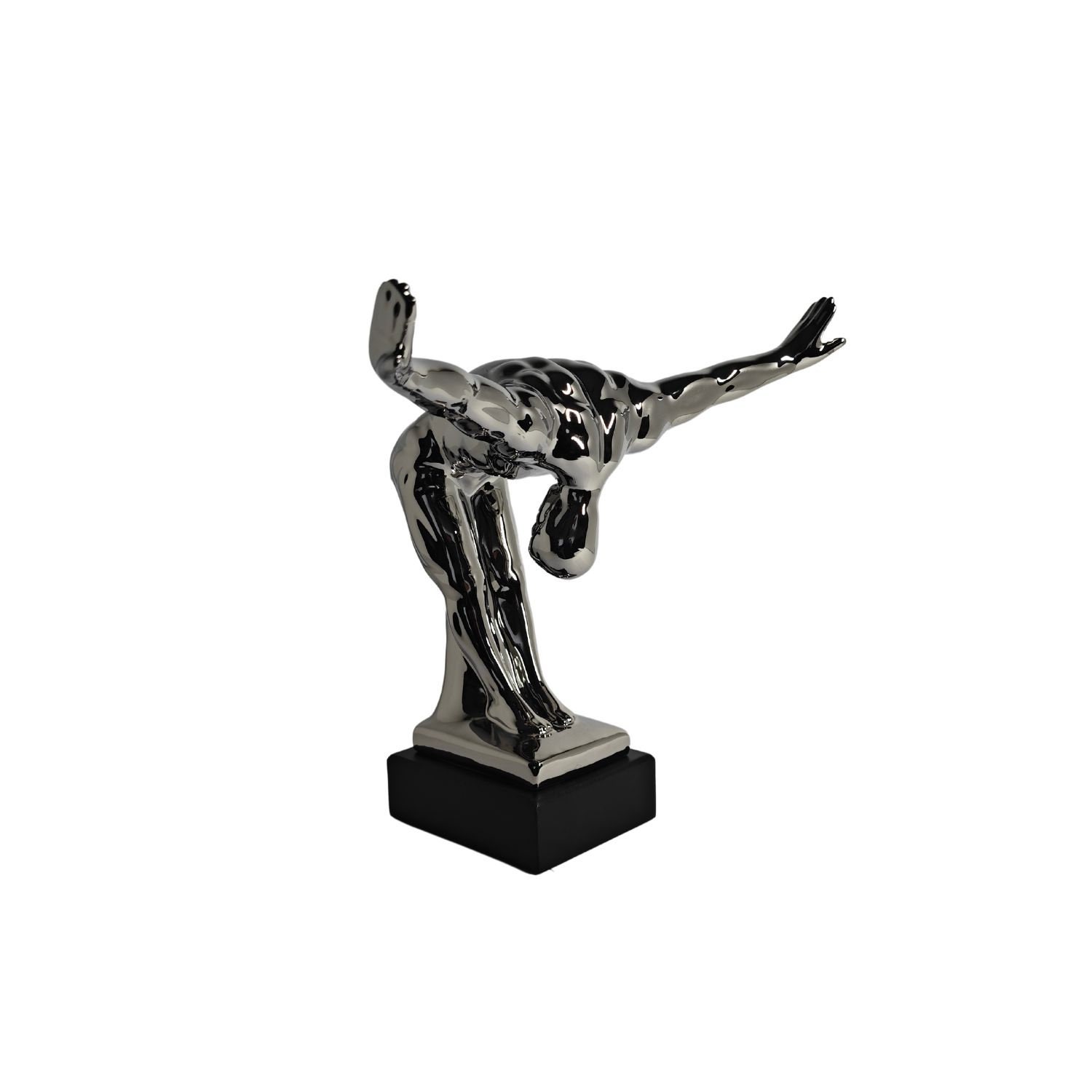 Modern sculpture of a bowing man. The sculpture is made of ceramic/porcelain with a silver coating, and the base is made of resin with a black coating. This sculpture integrates almost seamlessly into the living space. The dimensions are as follows: